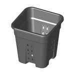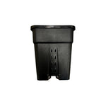 Es ist ein 4-eckiger, stabiler Topf aus schwarzem Kunststoff. mit glatter Oberfläche, der vielfach wieder verwendet werden kann.