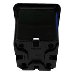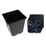 Eckiger Pflanztopf aus schwarzem Kunstoff mit Belüftunglöchern am Boden.